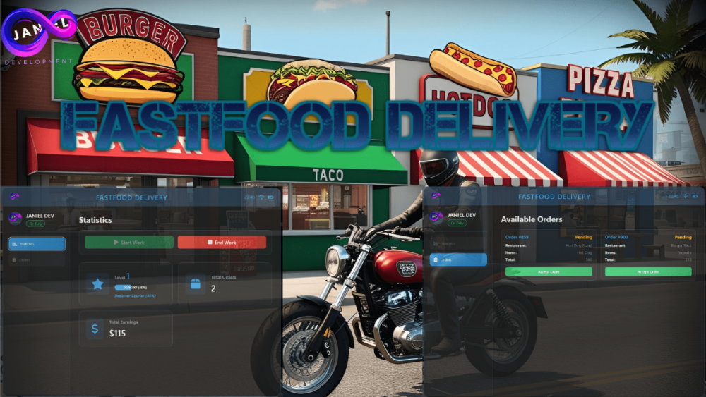 # Janiel Delivery - Premium Food Delivery Job Script Transform your FiveM server's delivery experience with our advanced food delivery job script. Features a sleek tablet interface, progression system, and extensive customization options. 📸 PREVİEW 📸 🌟 Key Features - Modern Tablet UI - Level & XP System - Multiple Restaurant Support - Custom Notifications - Progress Tracking - Regular Updates 💎 Premium Support - Discord Support - Regular Updates - Bug Fixes - Feature Requests 🎮 Compatible With - QBCore - ox_inventory - ox_target - Multiple notification systems ⚡ Performance Optimized - 0.00ms Idle - Efficient Resource Usage 🛠️ Fully Configurable - Easy Setup - Detailed Documentation 🔒 Requirements - QBCore Framework - oxmysql - ox_lib ## Support - Discord: [https://discord.gg/N9b3REEQTN] - Documentation: [https://janiel.gitbook.io/janiel-resources] -Buy: [FREE]