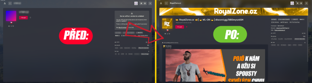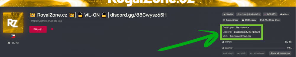 Ahoj, prezentace serveru a první dojem je jeden z velmi důležitých aspektů jak oslovit více lidí na tvůj server, proto jsem tu dnes od toho, abych ti pomohl toho docílit 😎! 1. Jméno serveru - Úplným základem je se zviditelnit, proto to chce chytlavé a výstižné jméno (myšleno něco krátkého), co se dobře zapamatuje✨! - Dají se použít různé styly, buď jednoduše pouze název serveru💬 a nebo přidání hlavních informací📄 a to například WL-ON/WL-OFF, odkaz na discord, info o frakcích. - Použij ve jméně lomítka, dobře to oddělí různé informace a vypadá to cool 🤙! - [] , <> , | , ● atd. atd. - Použij emoji! Také supr věcička ve jméně, více nadchne než čistý text! Klikni > ZDE < pro list emoji 😉! - Použij BARVY ve jméně! Já toho nejsem moc zastánce, ale pokud se to dobře vyváží, může to vypadat velmi libově🔴🟠🟡🟢🔵! Například: sv_hostname "^0[CMRP] 💫 ^5[CZ/SK] [WL] RolePlay 💥 ^82024 | DEV" Čísla a barvy: ^0 - Bílá ⚪ ^1 - Červená ^2 - Zelená ^3 - Žlutá ^4 - Modrá ^5 - Světle modrá ^6 - Fialová ^7 - Bílá ⚪ ^8 - Oranžová ^9 - Šedivá 2. Server Icon - Serverová ikona by se měla odvíjet od názvu serveru. Například my máme název RoyalZone, a proto máme ikonu RZ s iniciálami, nebo když se jmenuješ Diamond, tak tam dej třeba ikonu diamantu, je na tobě co si vybereš 😋. Jak na změnu ikony: 1. Otevři ftp a jdi do složky - server-data (kde se ti nachází server.cfg) 2. Otevři server.cfg 3. Najdi tento řádek a pokud ho nemáš tak ho vytvoř! ↓↓ load_server_icon myLogo.png 4. myLogo.png změň na název obrázku, který zde chceš nahrát. - Např. RoyalZone.png (POZOR! Obrázek musí mít 96x96 pixelů a musí být ve formátu .png!) ZDE uprav obrázek 5. Nahraj obrázek na ftp do stejné directory, jako je server.cfg, takže do [server-data] HOTOVO A GRATULUJI! NENI TO TAK HARD NE? TAK LETS GO A JDEME DÁL :D! 3. Banner - Banner, jaká to krásná věc, která vyplní tu prázdnotu, která tam bez něj je. Co si budeme, bez něj to není to pravé ořechové🍈! - Na velikosti banneru nezáleží, prostě nějaký .png obrázek co bude obdélníkového tvaru. Jak na to: 1. Vytvoř obrázek 2. Nahraj ho na net, například -> ZDE <- 3. Zkopíruj odkaz 4. Otevři server.cfg 5. Napiš zde toto: sets banner_detail "https://r2.fivemanage.com/wHT6d5Ld0cNodEeIBUDI8/rzbanner.png" 6. Do uvozovek vlož svůj odkaz na obrázek a máš hotovo! 4. Popisek - Prostá, ale přesto velmi přínosná funkce. Popiskem můžeš ve zkratce prezentovat svůj server, říct hráčům co nabízí a na co se mohou těšit🕍. Jak na to: 1. Otevři server.cfg 2. Najdi nebo zadej toto: sets sv_projectDesc "- Připravujeme server pro Vás" 3. Přepiš to co je v závorkách na libovolný text a VOALA máme hotovo! 5. Odkazy, informace ... - Krásná funkce, kterou by bylo hřích nevyužít a že těch serverů co to nevyužívá je hodně🤯. - Ukaž komunitě a novým hráčům svoje webovky, discord server, dej jim informace jaké chceš! Jak na to: 1. Otevři si server.cfg 2. Napiš zde toto: sets nadpis odkaz Takhle to vypadá v server.cfg: (Dvojtečka se tam dá automaticky a řadí se to podle abecedy. Developer je první, protože začíná na D a Web poslední, protože začíná na W) 6. Feed serveru - Tak jo, poslední věc, která je fakt mega cool a dají se s ní dělat divy. Moc serverů ji nemá, protože ani neví že tato možnost zde je, takže pojďme se podívat na to, jak to udělat. Jak na to: 1. Založ si účet na MASTODON - ZDE 2. Najdi svůj odkaz na účet 3. Zkopíruj svůj odkaz a vlož ho do server.cfg v této podobě BEZ PRVNÍHO @ sets activitypubFeed RoyalZone@mastodon.social (Udělej to jako já, jen pozměň náš účet za svůj 😊) 4. Nahraj na ten účet fotky, svoje myšlenky, dev-logy, vše co tě napadne a do 20min od postnutí to máš i na své hlavní stránce na server page! Snad byl návod k něčemu užitečný a snad pomohl, přeji hezký den a GL s Developingem! - Neznamycz3 points