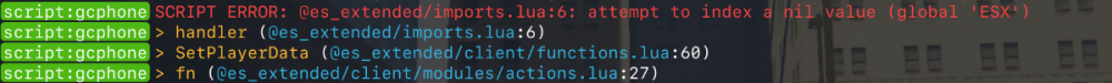 [ 791313] [ GTAProcess] MainThrd/ ^1SCRIPT ERROR: @es_extended/imports.lua:6: attempt to index a nil value (global 'ESX')^7 [ 791313] [ GTAProcess] MainThrd/ ^3> handler^7 (^5@es_extended/imports.lua^7:6) [ 791313] [ GTAProcess] MainThrd/ ^3> SetPlayerData^7 (^5@es_extended/client/functions.lua^7:60) [ 791313] [ GTAProcess] MainThrd/ ^3> fn^7 (^5@es_extended/client/modules/actions.lua^7:27) Ještě tohle ve hře mám, nevim jak to mám spravit bohužel.