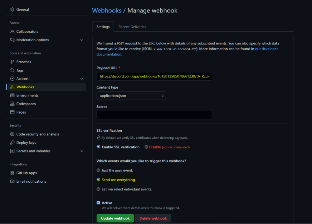 V nastavení repozotáře najdeš položku webhook Jen je potřeba za URL dodat /github Ukázková url: https://discord.com/api/webhooks/101263453245sadghsakdjlgsafdkjsadgfsdakjWyPVZdOJYBOQile2-MXsadkjglsakjdm6bo25C3RjP/github